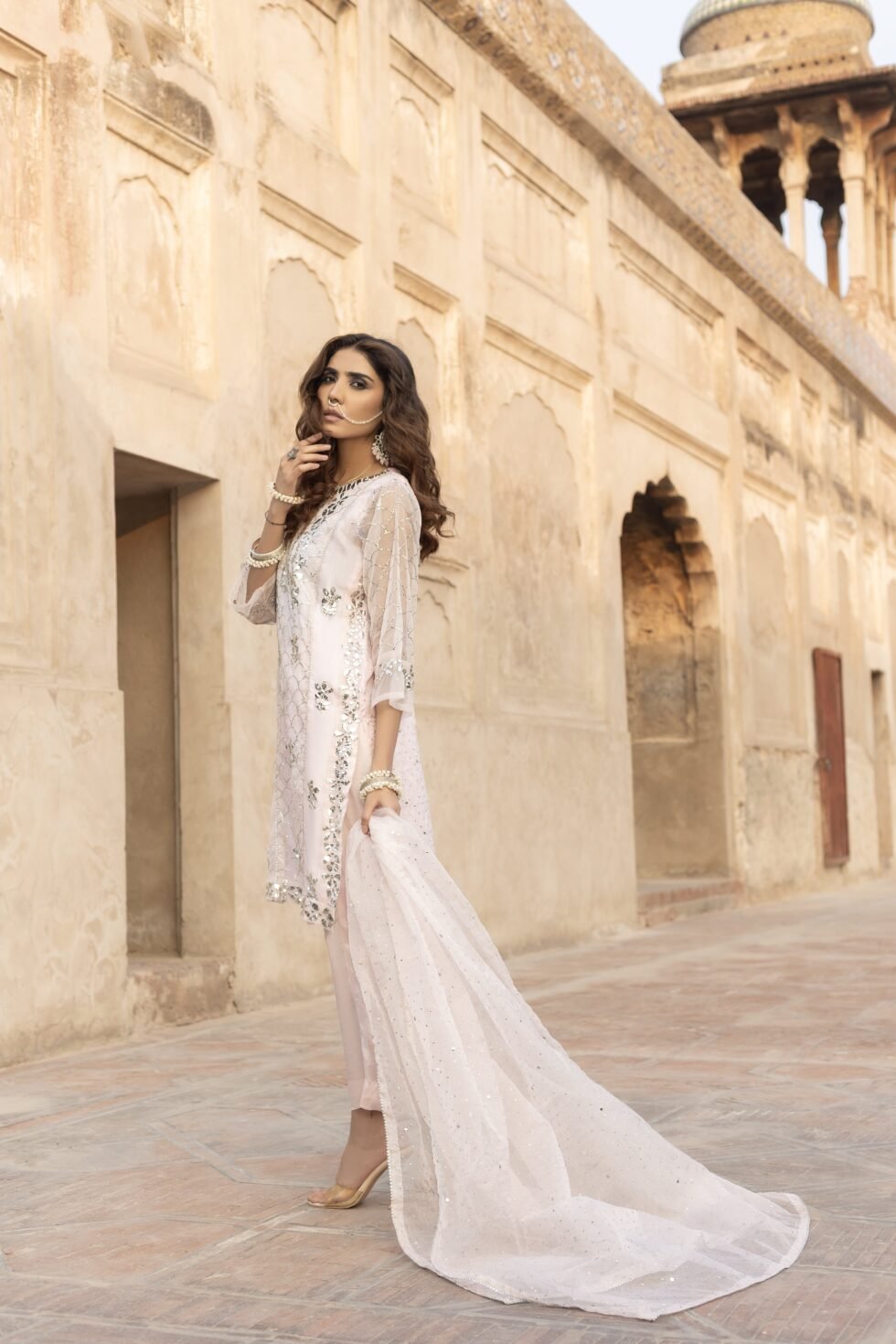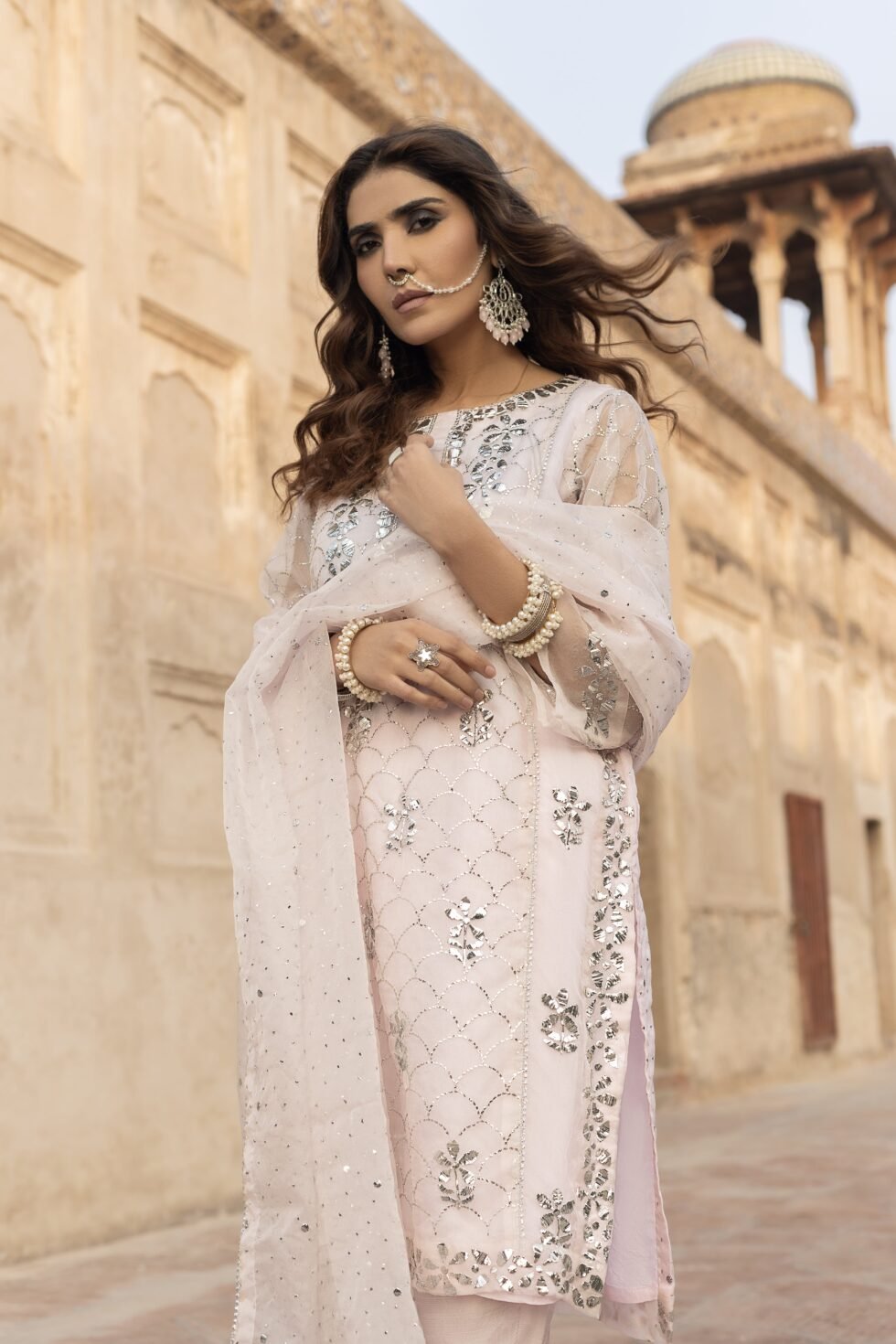 Elevate your festive wardrobe with this traditional nude pink kurta trouser dupatta, adorned with intricate Mukesh work. Perfect for weddings, parties, or cultural celebrations.